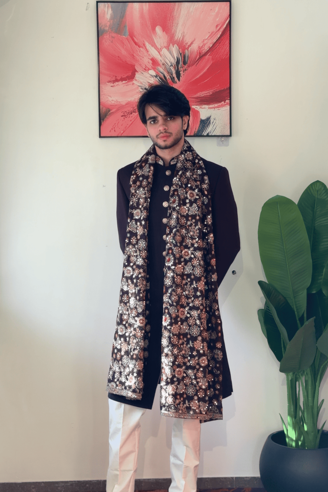 Three-Flap Embroidered Sherwani with Luxuriously Embellished