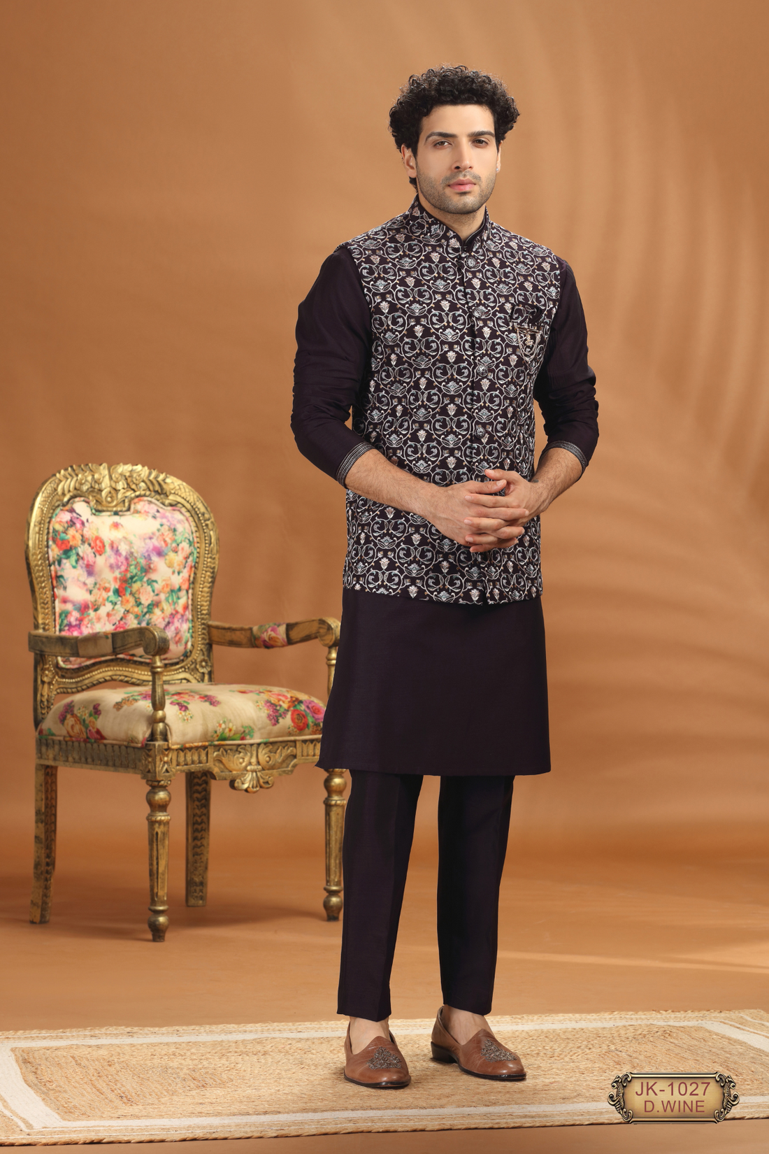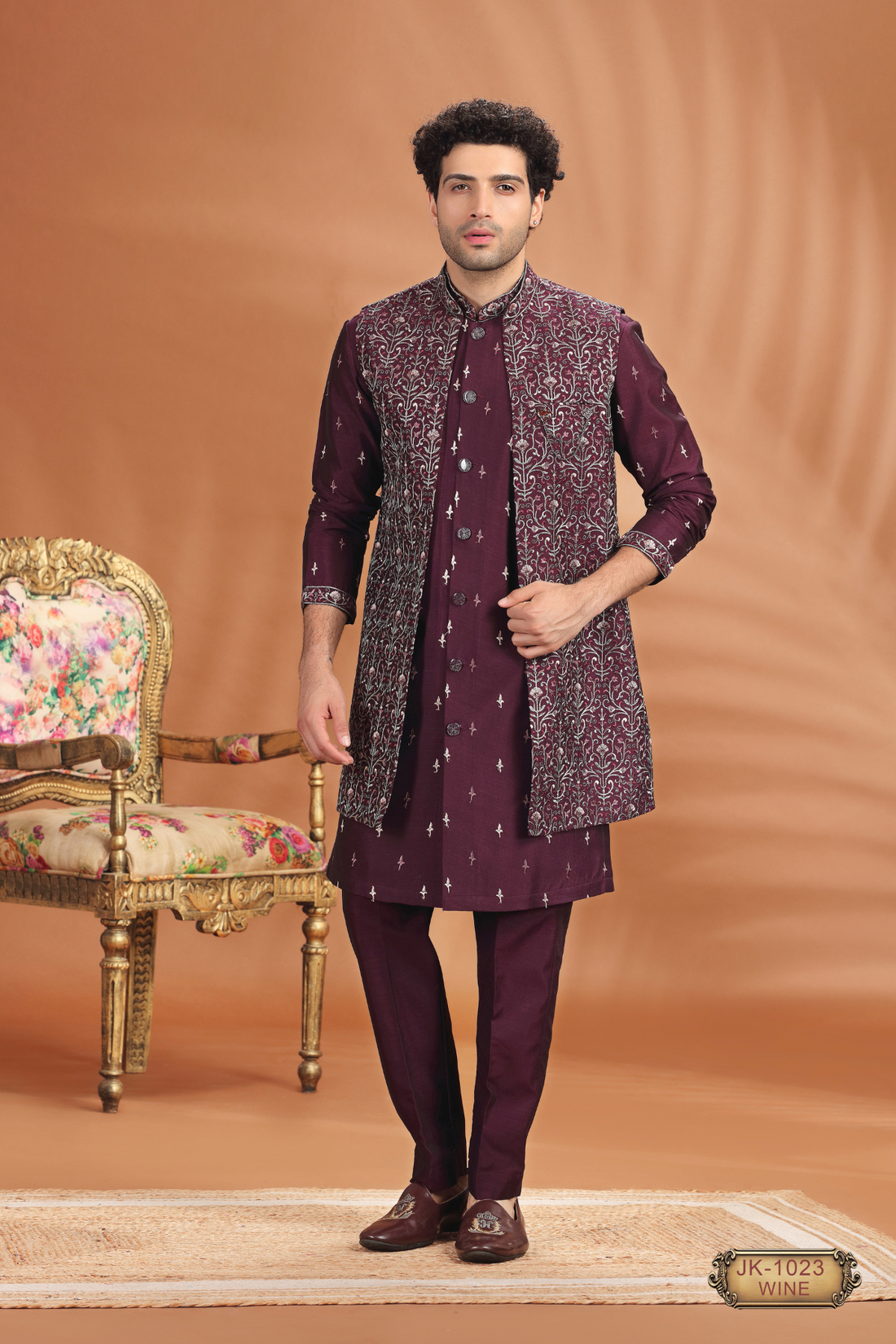 Embroidered Indo Western Open Jacket Set for Men(Bottle Green and Wine)| Wedding & Festive Wear