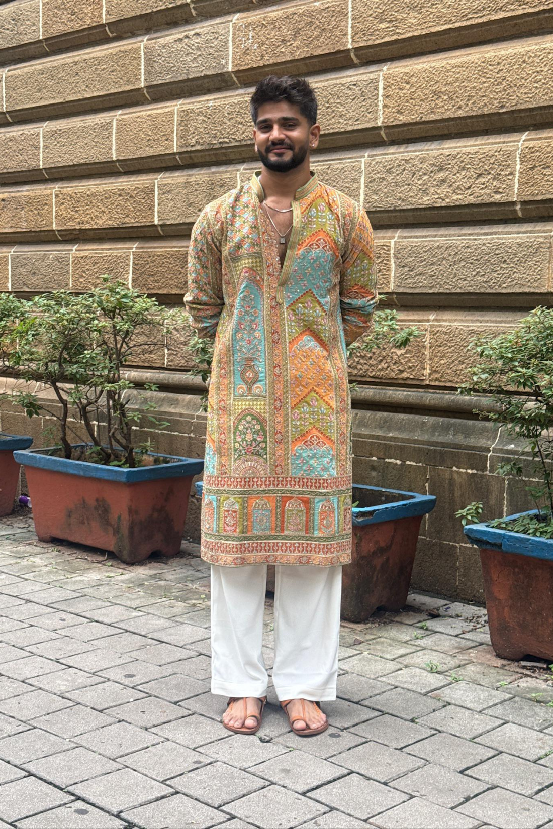 Multicolor Embroidered Cream Kurta for Men โ Festive & Wedding Wear