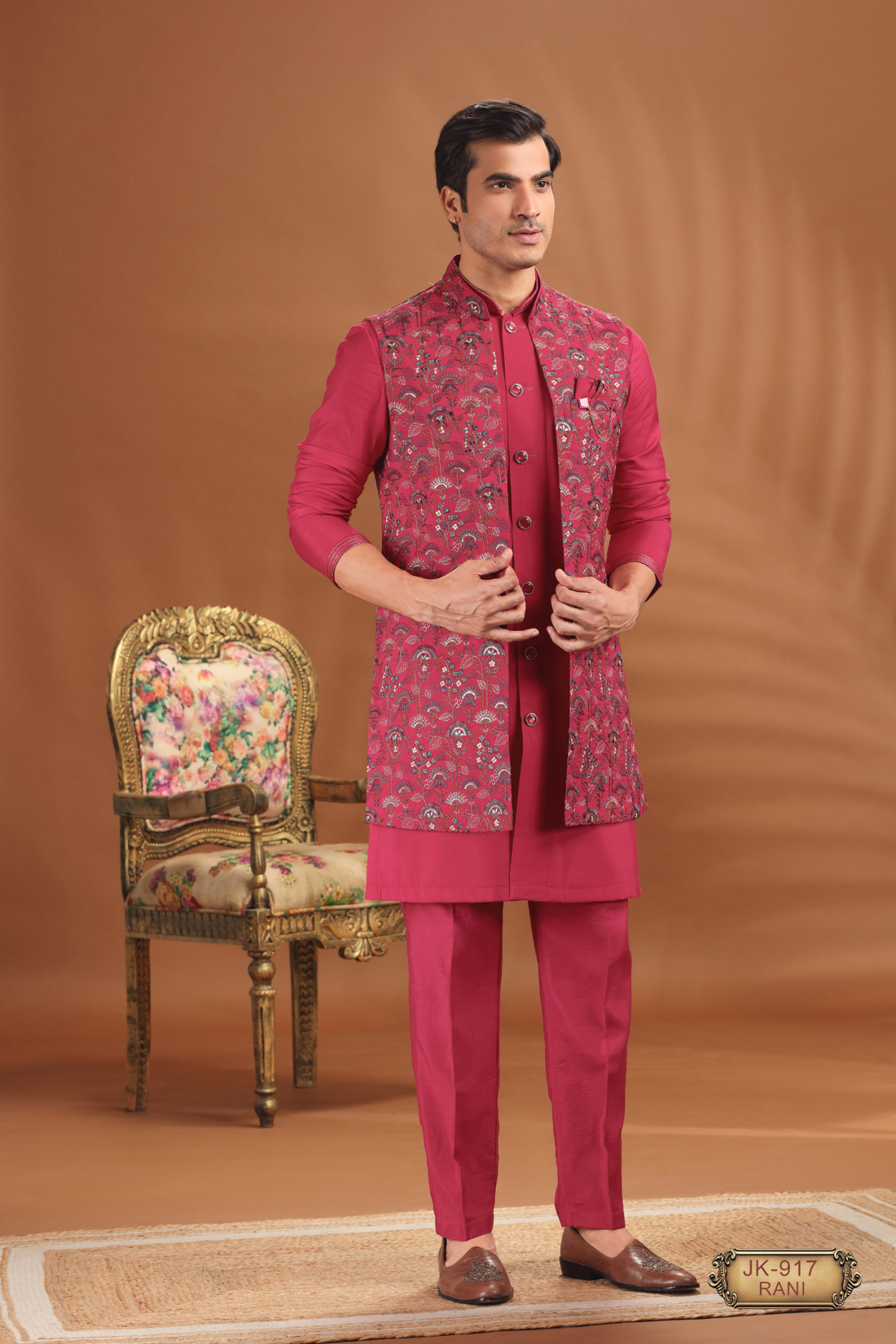 Royal Embroidered Open Jacket Kurta Set for Men โ Rani & Teal Blue | Festive & Wedding Indo-Western Setโ