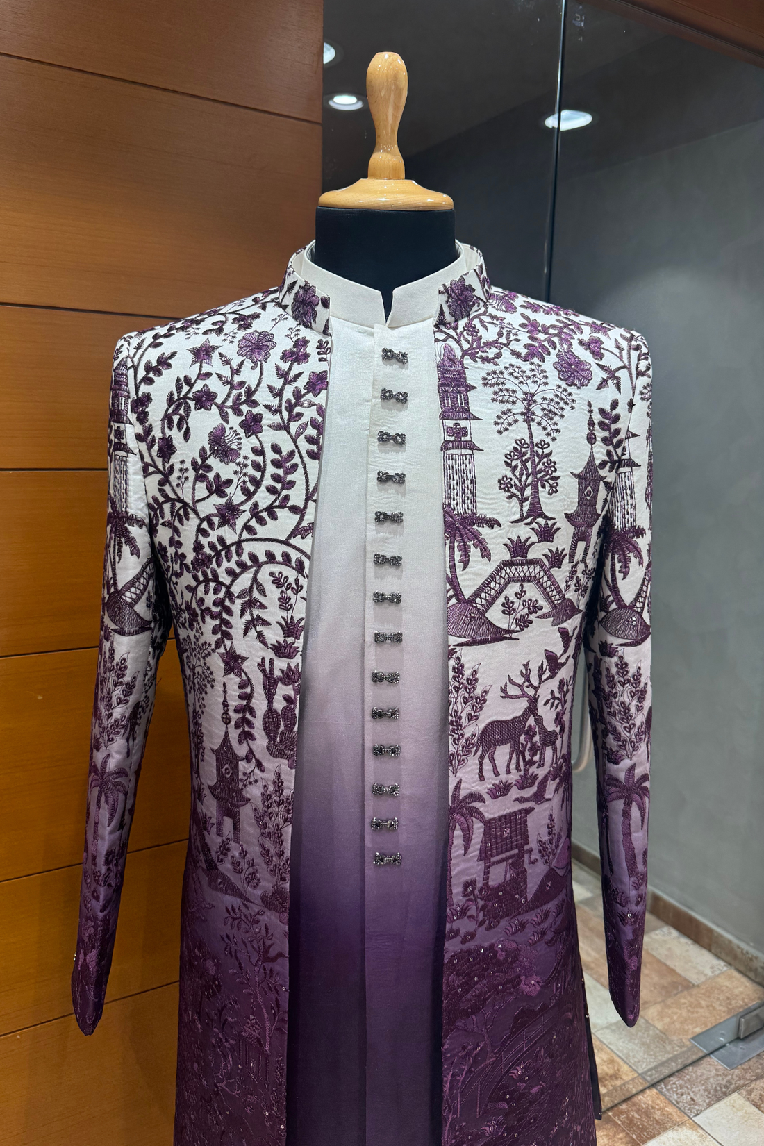 Lavish Purple Ombre Indo-Western, designed for men who love refined luxury. The outfit features a...