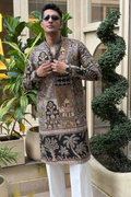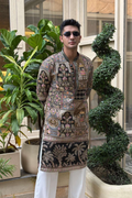 Crafted from premium position embroidered fabric, this kurta showcases intricate thread embroidery with royal motifs – elephants, palaces, coins, and floral artistry. The rich combination of black and mehendi green adds a regal depth, making it the perfect choice for weddings, receptions, and festive occasions.