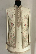 Classic Ivory Embroidered Indo-Western, designed for men who prefer refined ethnic style with a modern silhouette. Crafted in a soft ivory tone, this ensemble features delicate multicolour floral embroidery inspired by traditional Indian craftsmanship, giving it a graceful and luxurious appeal.