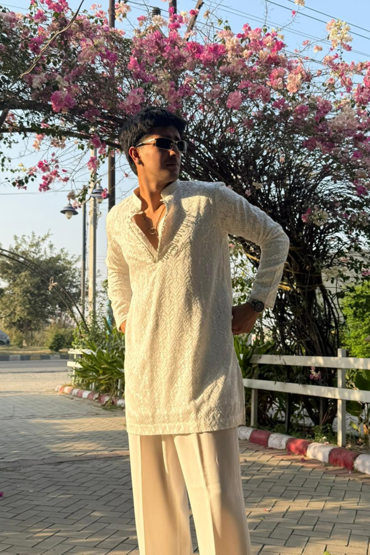 Crafted in a rich ivory shade, the kurta offers a royal yet subtle vibe — ideal for men who prefer a clean, classy aesthetic. Paired with soft cream trousers, the outfit ensures maximum comfort and effortless style throughout the day.