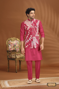 These Designer Coti Kurta Sets, available in Pink-Black and Rani, are perfect for men who want to blend traditional elegance with a modern edge. The jackets feature striking leaf-inspired motifs that bring a contemporary touch, paired with solid kurta pajama bases that keep the look refined and sophisticated. Crafted in premium fabric with fine detailing, these sets are ideal for weddings, sangeet nights, cocktail parties, or festive occasions โ making sure you stand out with effortless charm.