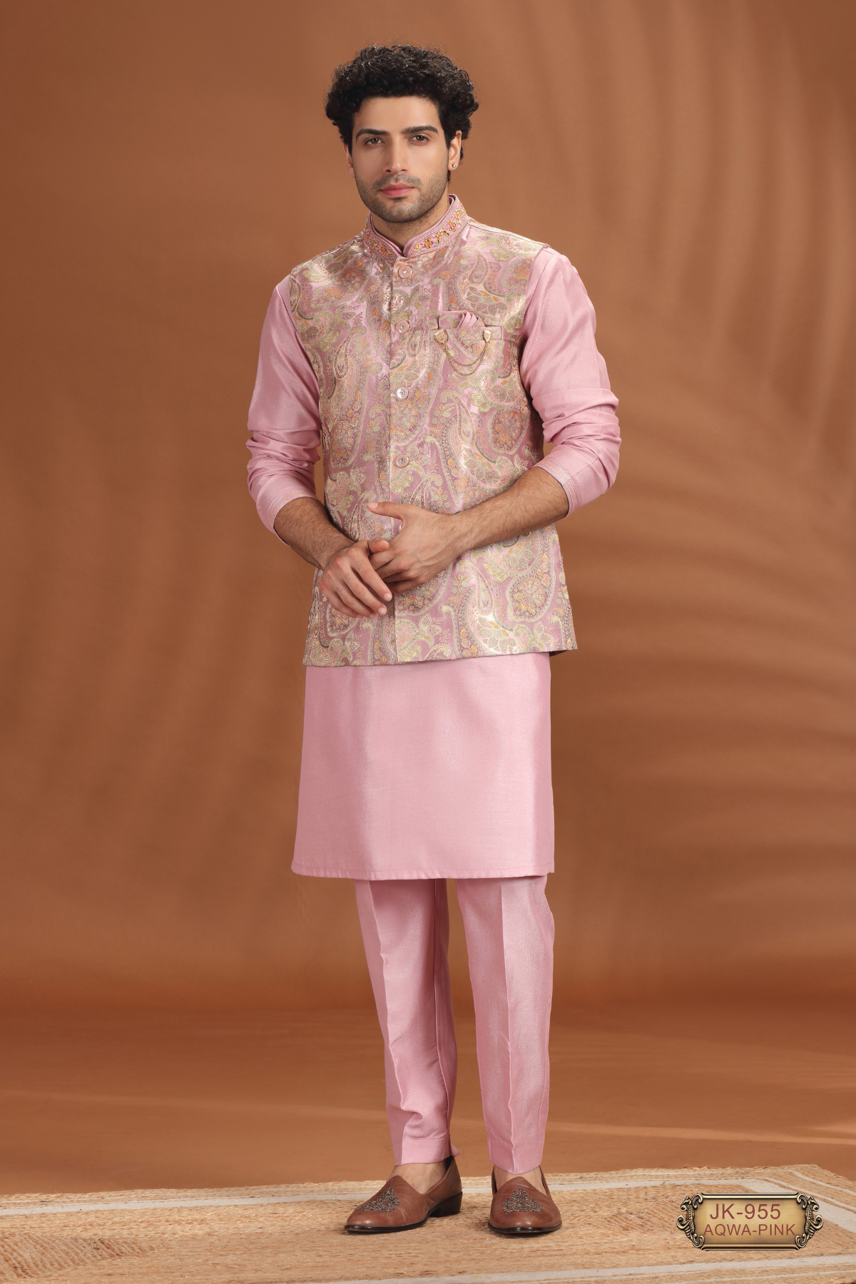 This Soft Pink Kurta Pajama Set paired with a designed coti jacket is the epitome of graceful sophistication. The pastel pink kurta pajama base gives a soft, classy vibe, while the paisley embroidered jacket adds a regal flair that makes it perfect for festive occasions. Crafted in premium fabric with intricate detailing, this set is ideal for weddings, engagements, sangeet nights, and cultural celebrations โ ensuring you shine with effortless style.