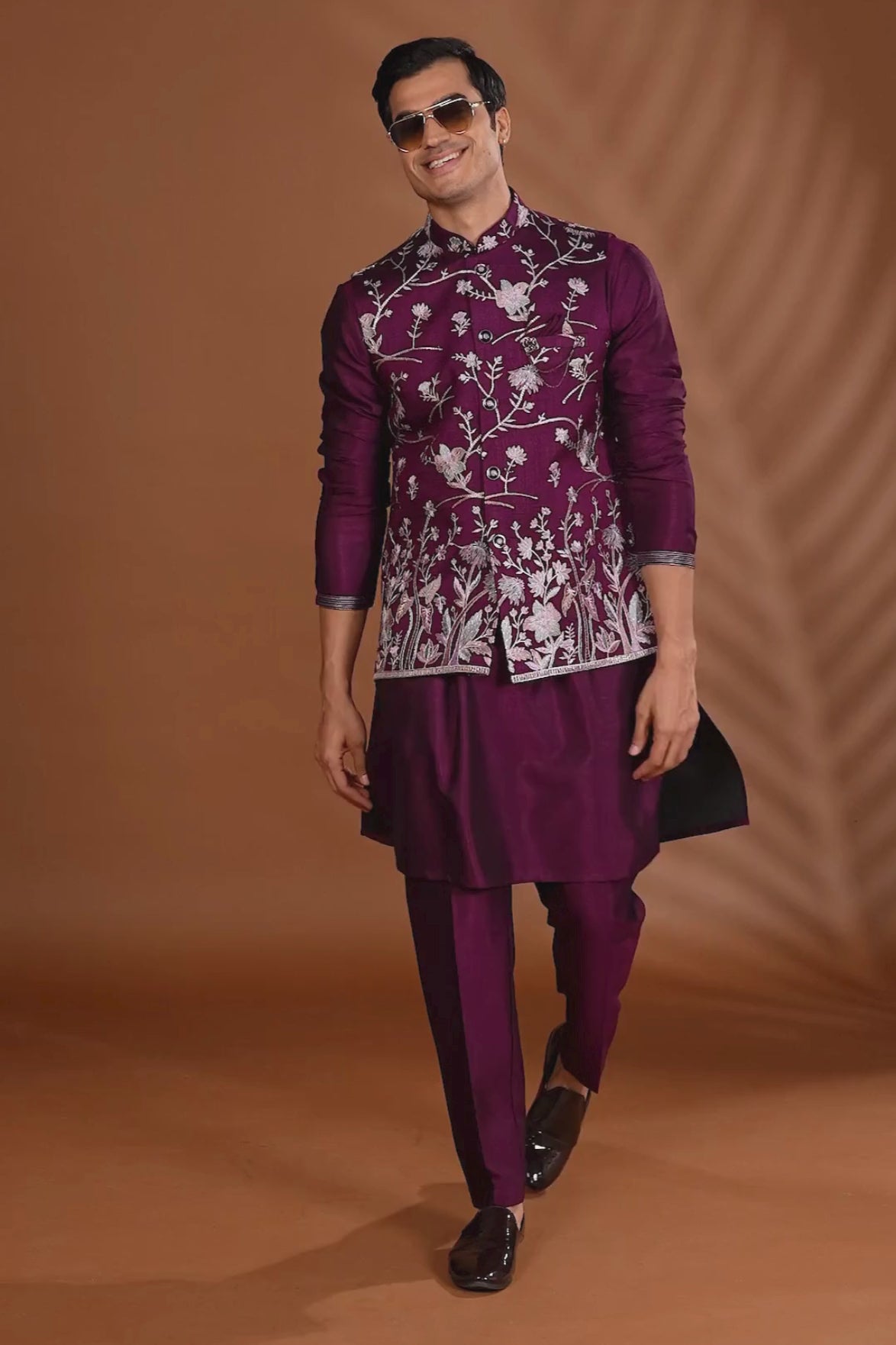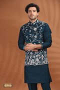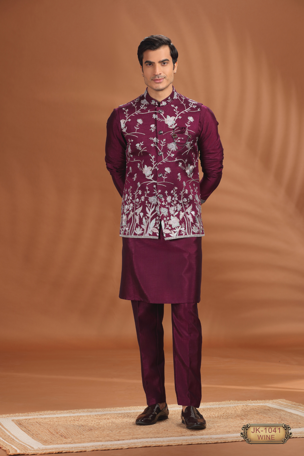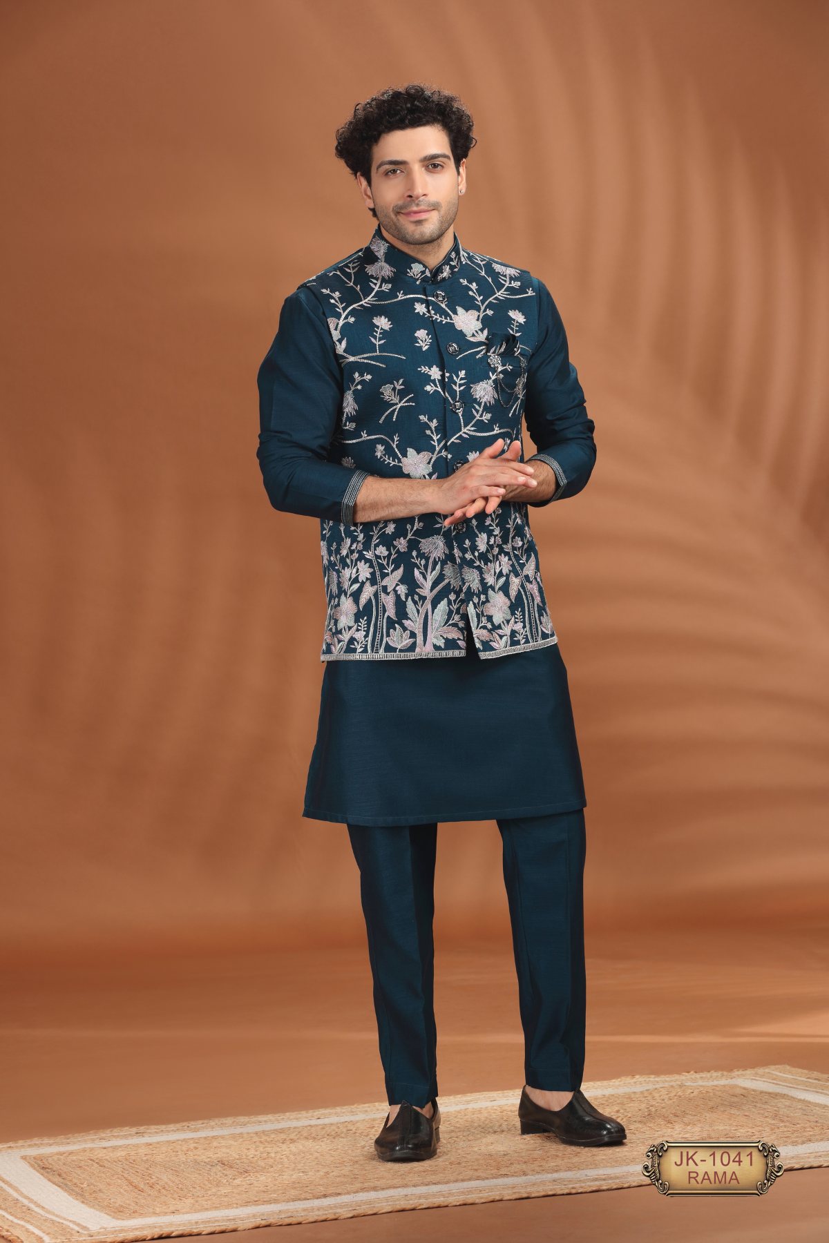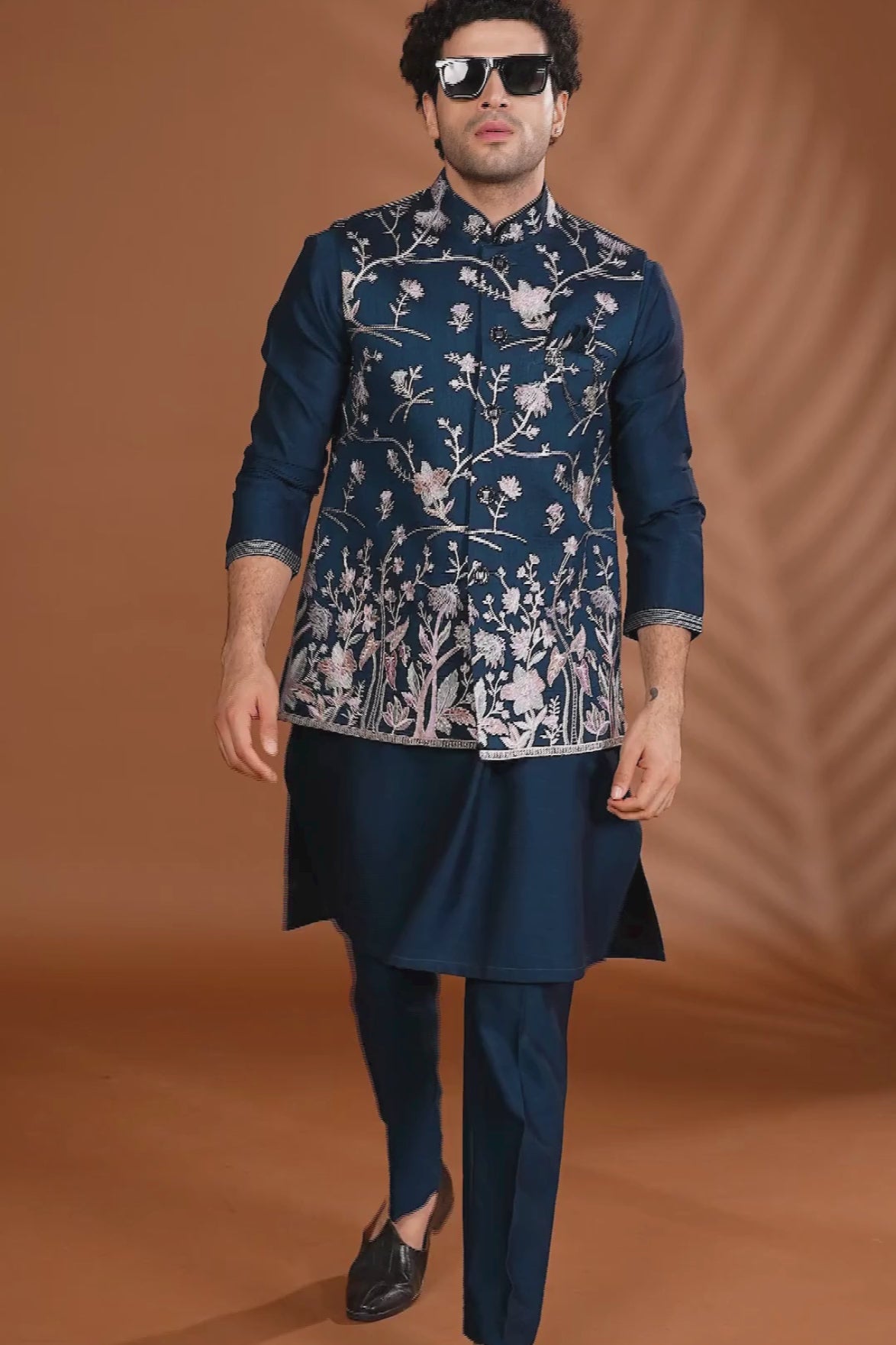 Redefine ethnic charm with this floral embroidered coti set, paired with a premium silk kurta pajama. Designed to balance tradition with modern elegance, this ensemble is perfect for weddings, sangeet nights, festive celebrations, and receptions. The floral threadwork on the coti jacket adds a touch of royal charm, while the luxurious silk base ensures comfort with class.