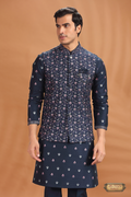 Step into festive elegance with these Bottle Green and Navy Coti Kurta Sets, each styled with a richly embroidered coti jacket over a matching kurta pajama. The all-over motifs and intricate detailing make these sets a perfect balance of heritage and modern sophistication.