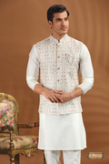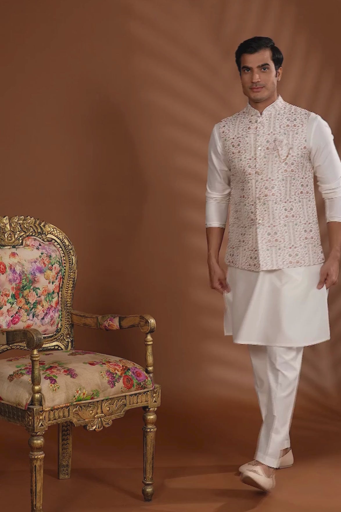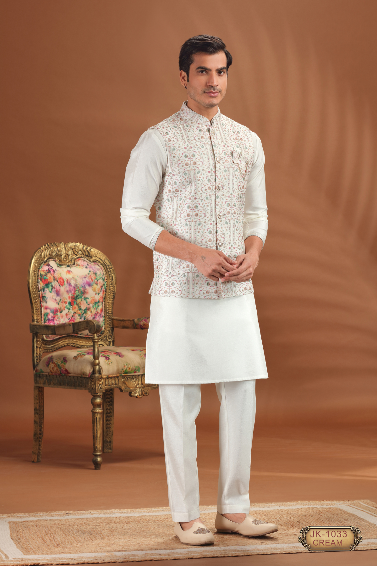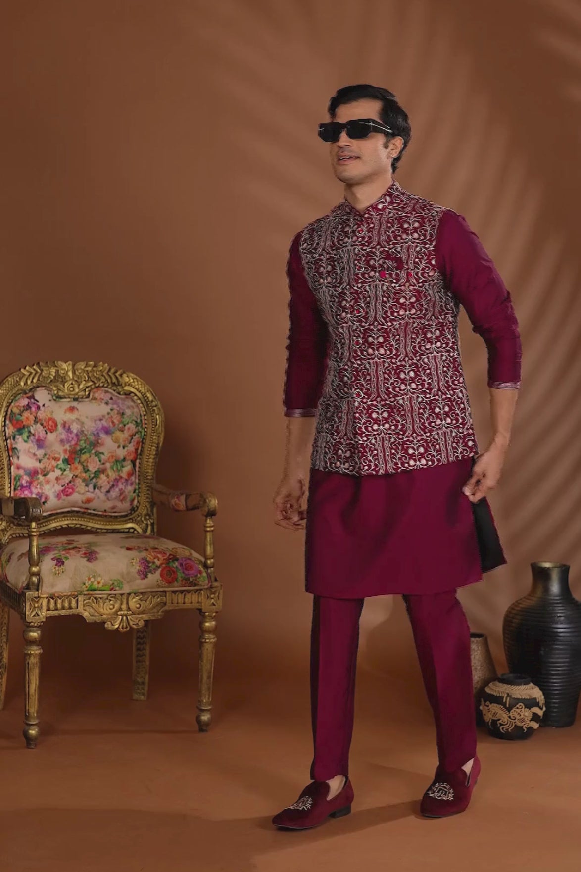 Turn heads this wedding season with these embroidered Coti Kurta Sets, available in rich Deep Rani and elegant Cream. Each set pairs a finely tailored kurta pajama with a short embroidered coti jacket, designed with intricate patterns that balance tradition and modern charm.