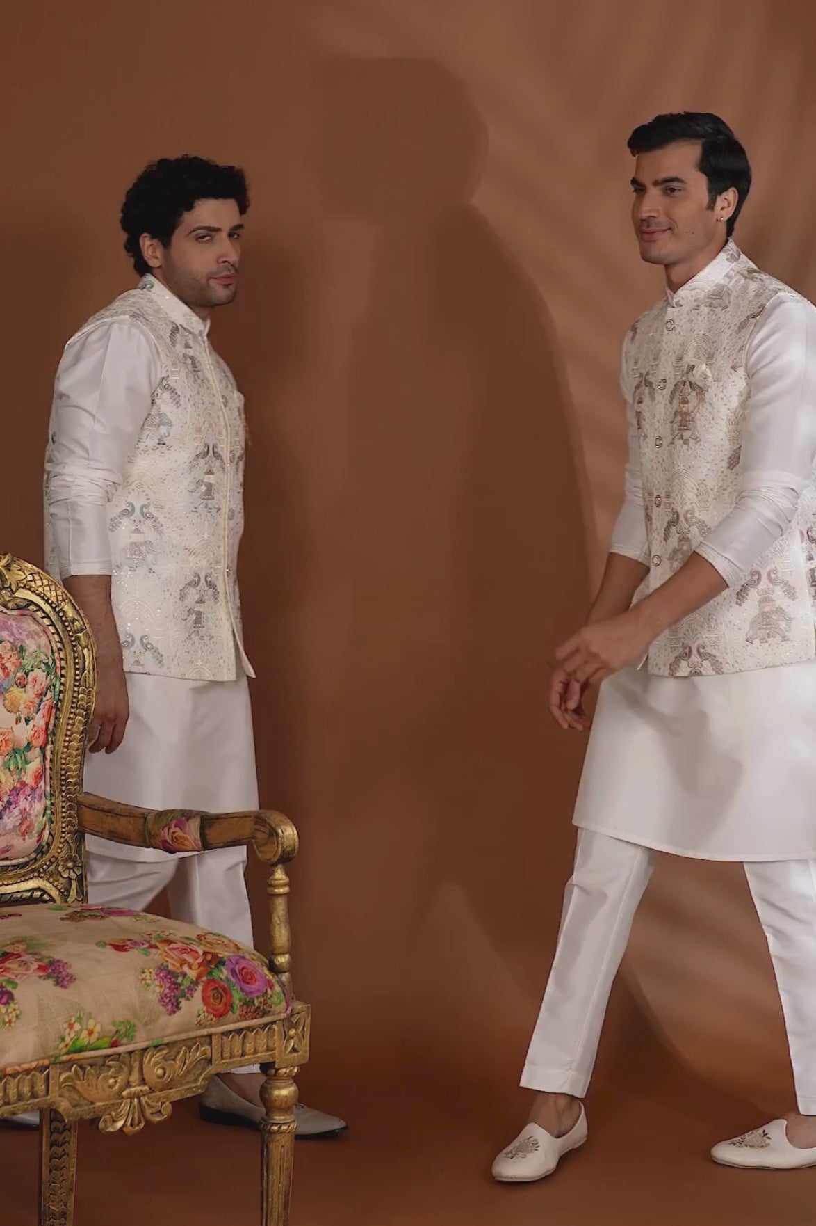 Men’s Designer Coti Set with White Kurta Pajama – Cream-Gray & Cream-Pink Variants