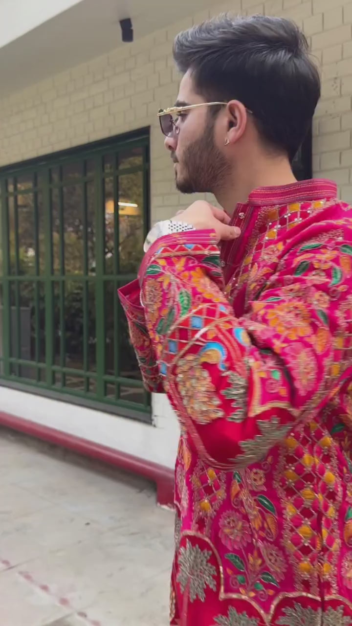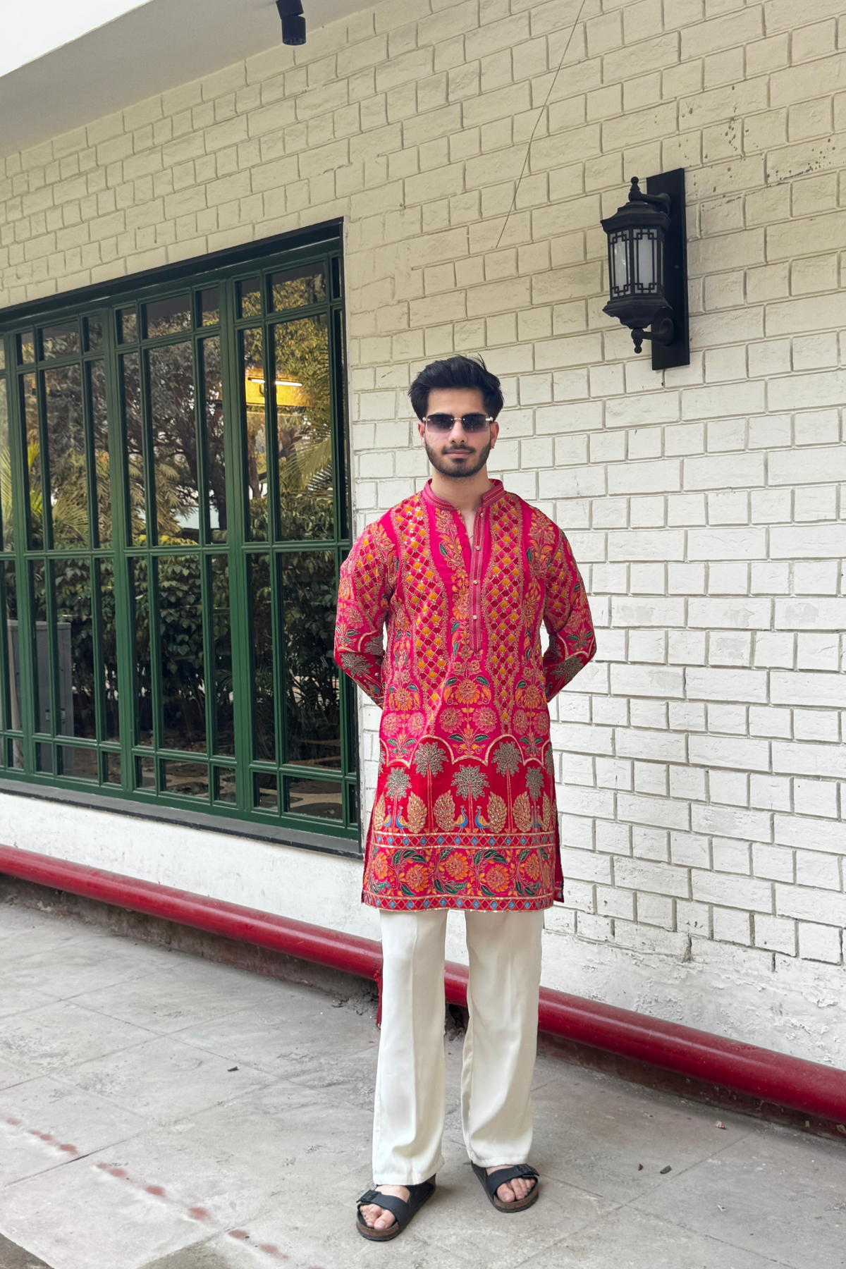 Elevate your festive wardrobe with this stunning pinkish red embroidered kurta, designed for men who appreciate bold colors and intricate craftsmanship. The vibrant pinkish red base is beautifully enhanced with detailed multicolor embroidery featuring floral, geometric lattice, and traditional peacock-inspired motifs.