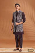 Make a sophisticated statement with our Embroidered Indo Western Open Jacket Set, crafted for men who appreciate contemporary elegance with traditional craftsmanship. This designer set includes a solid kurta and straight-fit trousers paired with a heavily embroidered open jacket, showcasing intricate paisley and floral patterns crafted with detailed resham and metallic threadwork.