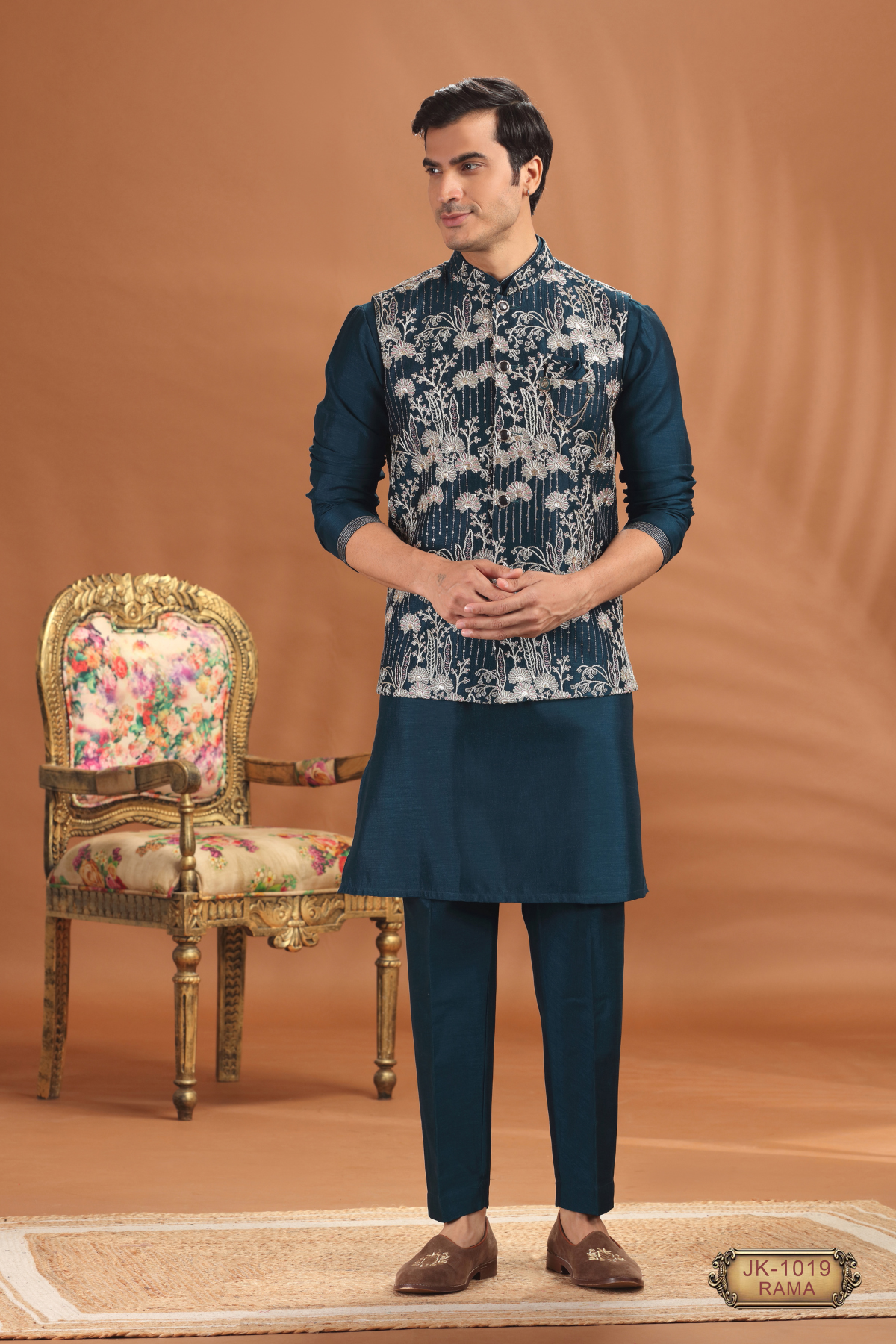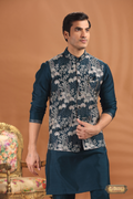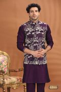 Elevate your festive wardrobe with these Purple and Rama Floral Coti Kurta Sets, featuring a richly embroidered floral coti jacket paired with a sleek kurta pajama. The detailed threadwork and timeless silhouette blend modern sophistication with traditional charm.