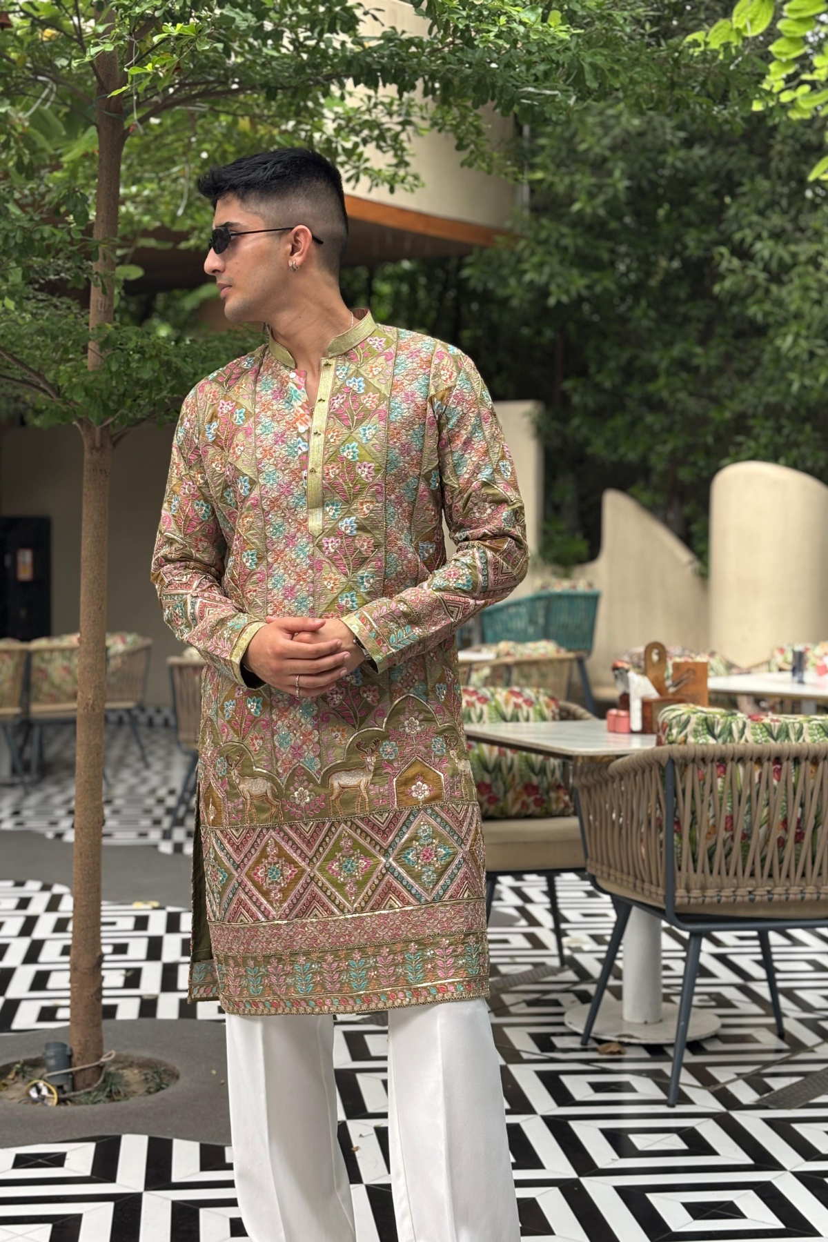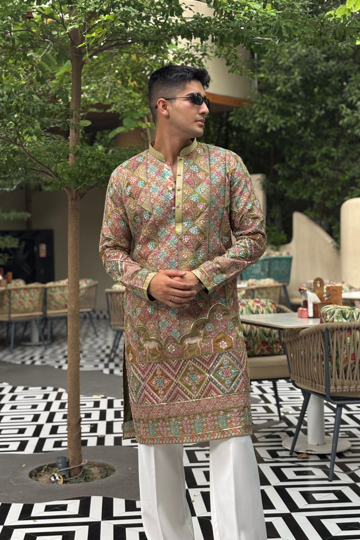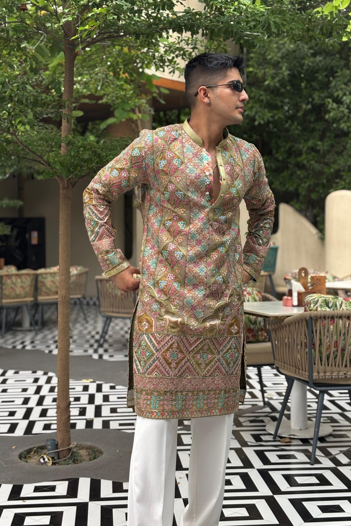 Step into elegance with this royal multicolor embroidered kurta, exclusively. Crafted with intricate floral and geometric embroidery, this kurta showcases a blend of traditional artistry and modern sophistication. The soft fabric ensures comfort, while the full-sleeve design and pastel tones make it perfect for weddings, festive occasions, or stylish gatherings.