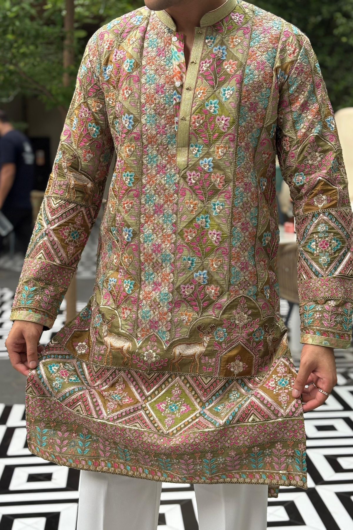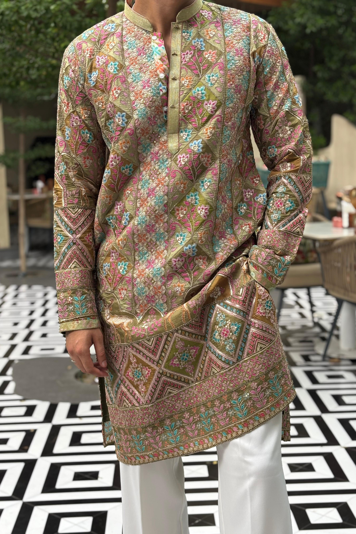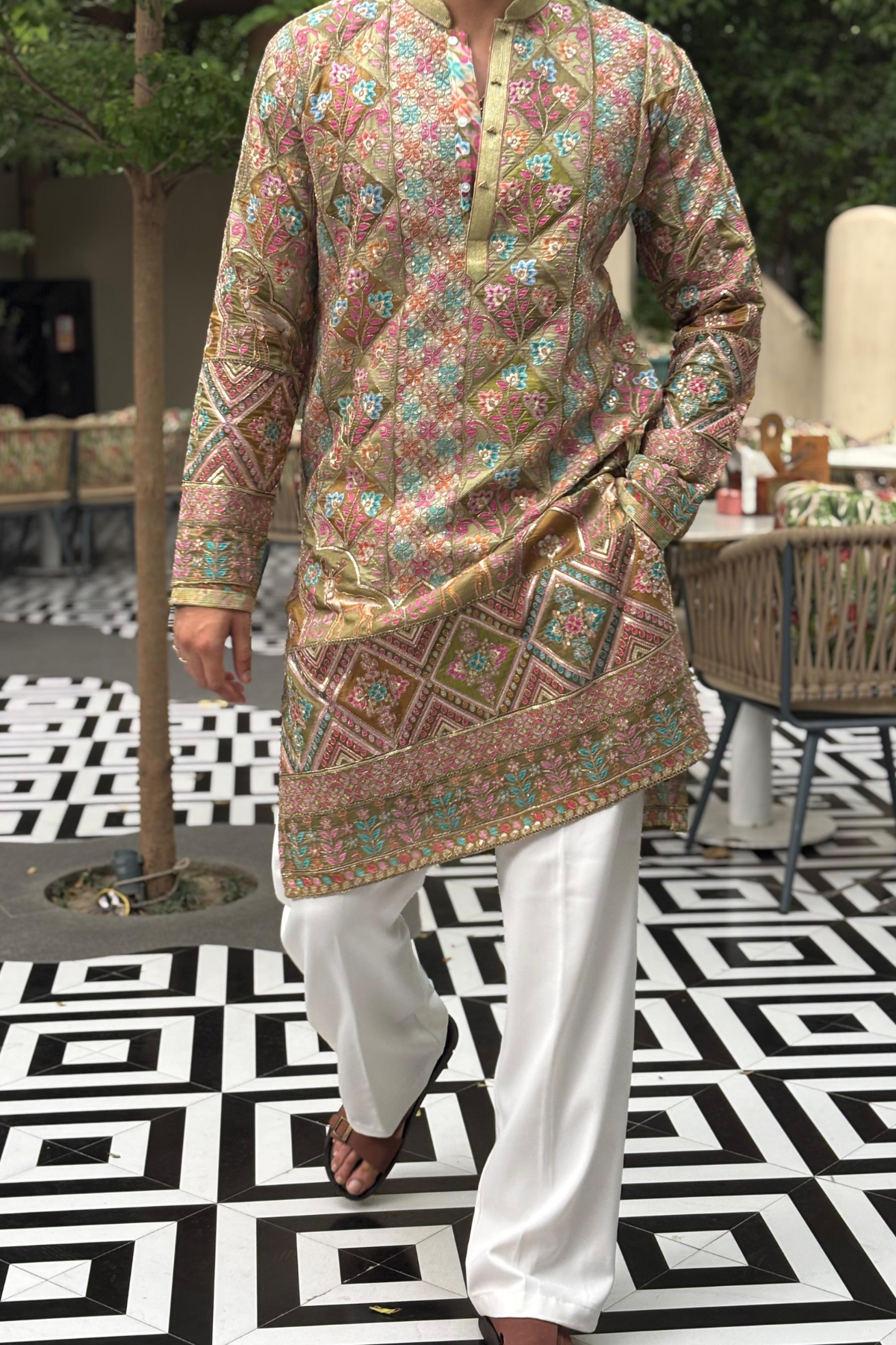 Step into elegance with this royal multicolor embroidered kurta, exclusively. Crafted with intricate floral and geometric embroidery, this kurta showcases a blend of traditional artistry and modern sophistication. The soft fabric ensures comfort, while the full-sleeve design and pastel tones make it perfect for weddings, festive occasions, or stylish gatherings.