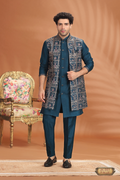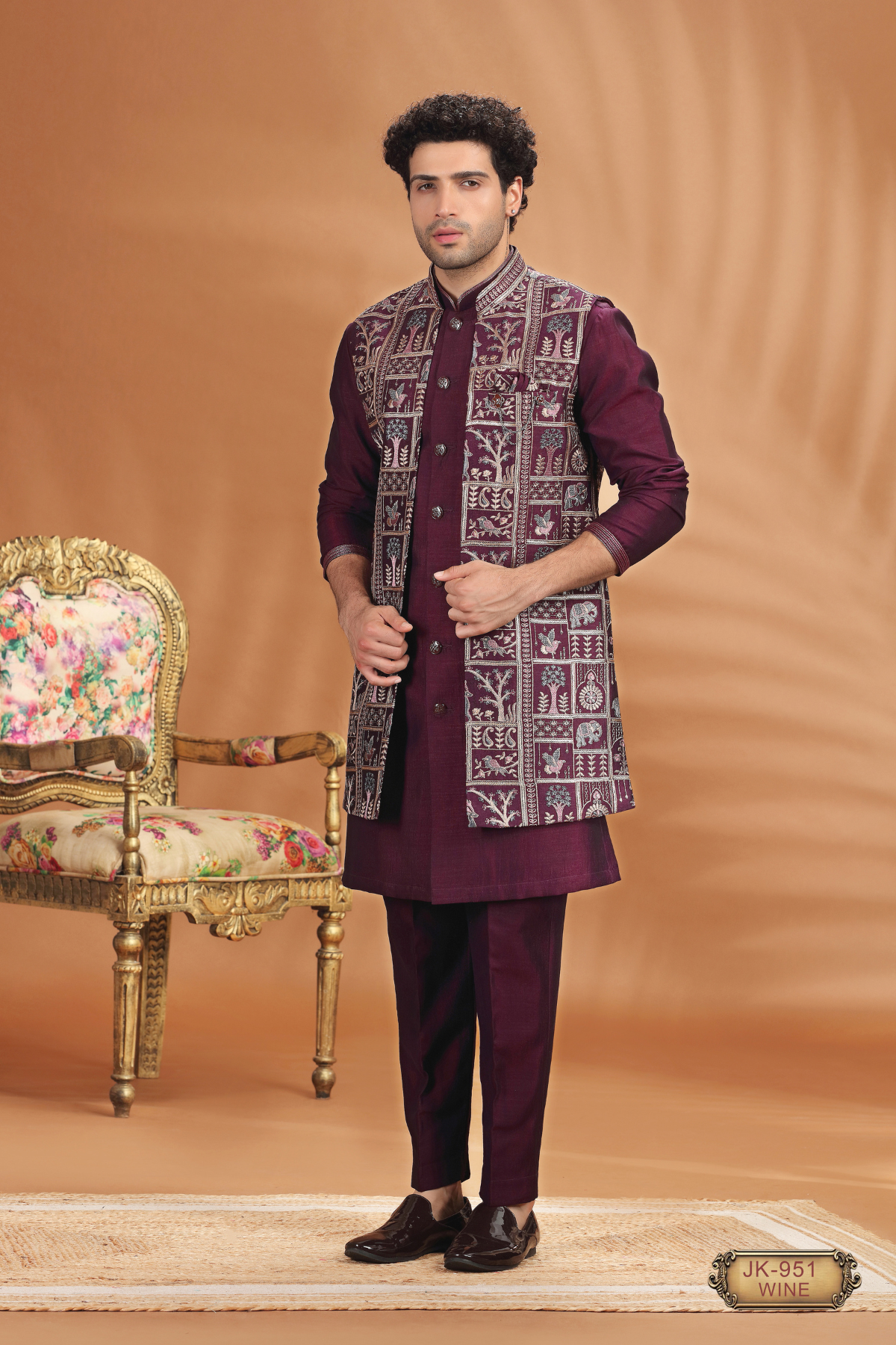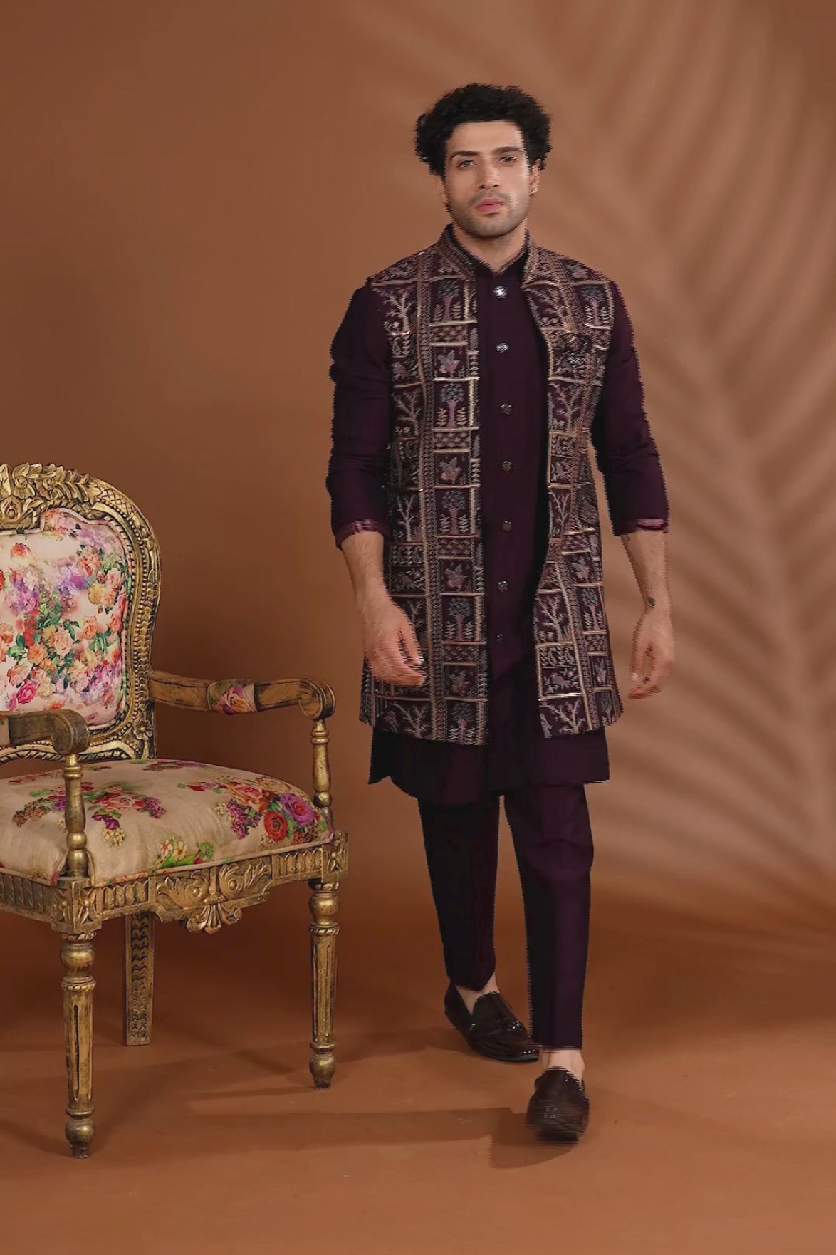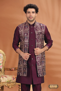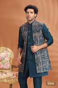Royal Embroidered Open Jacket Indo-Western Set for Men (Wine & Peacock Blue)