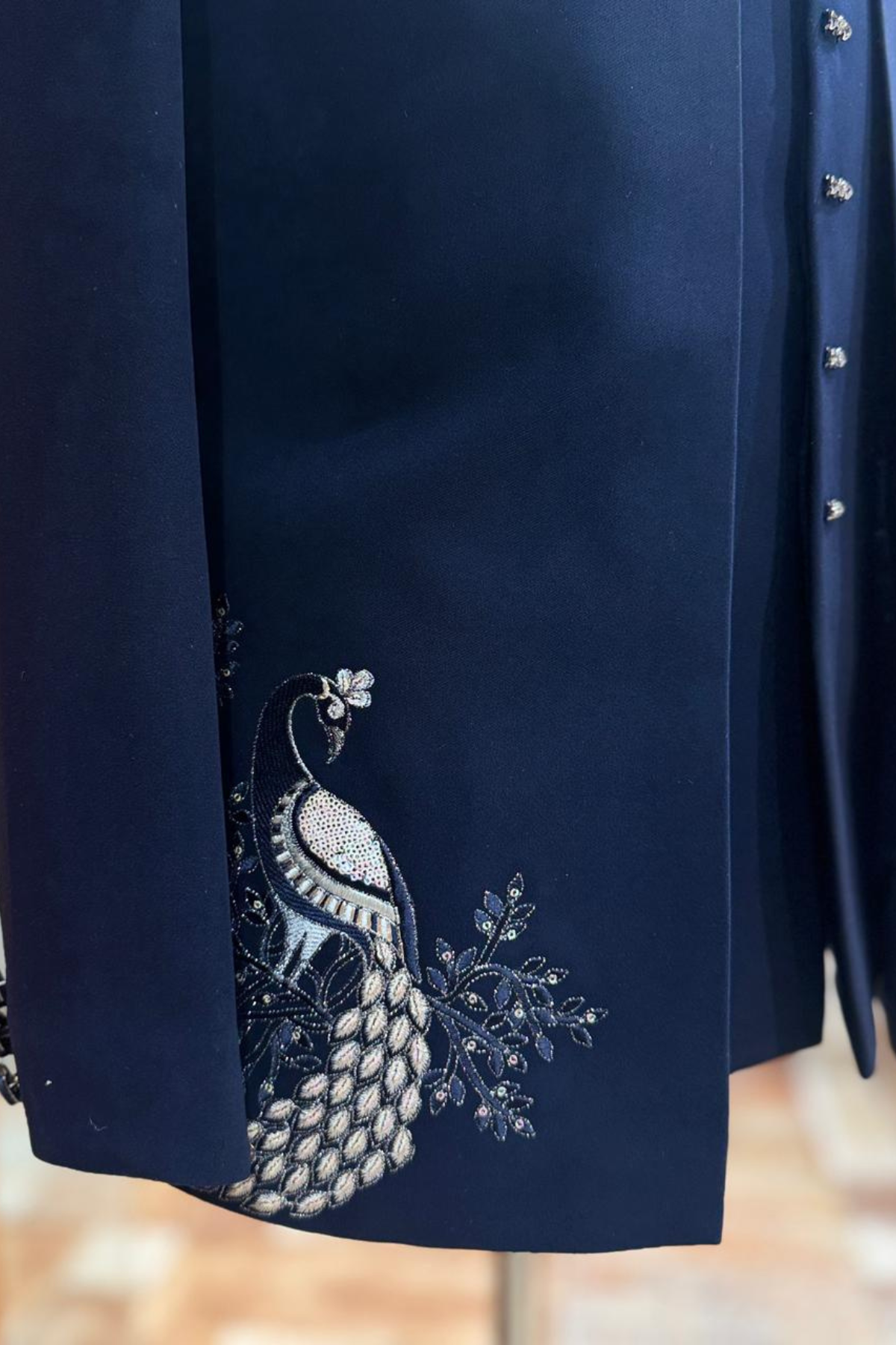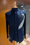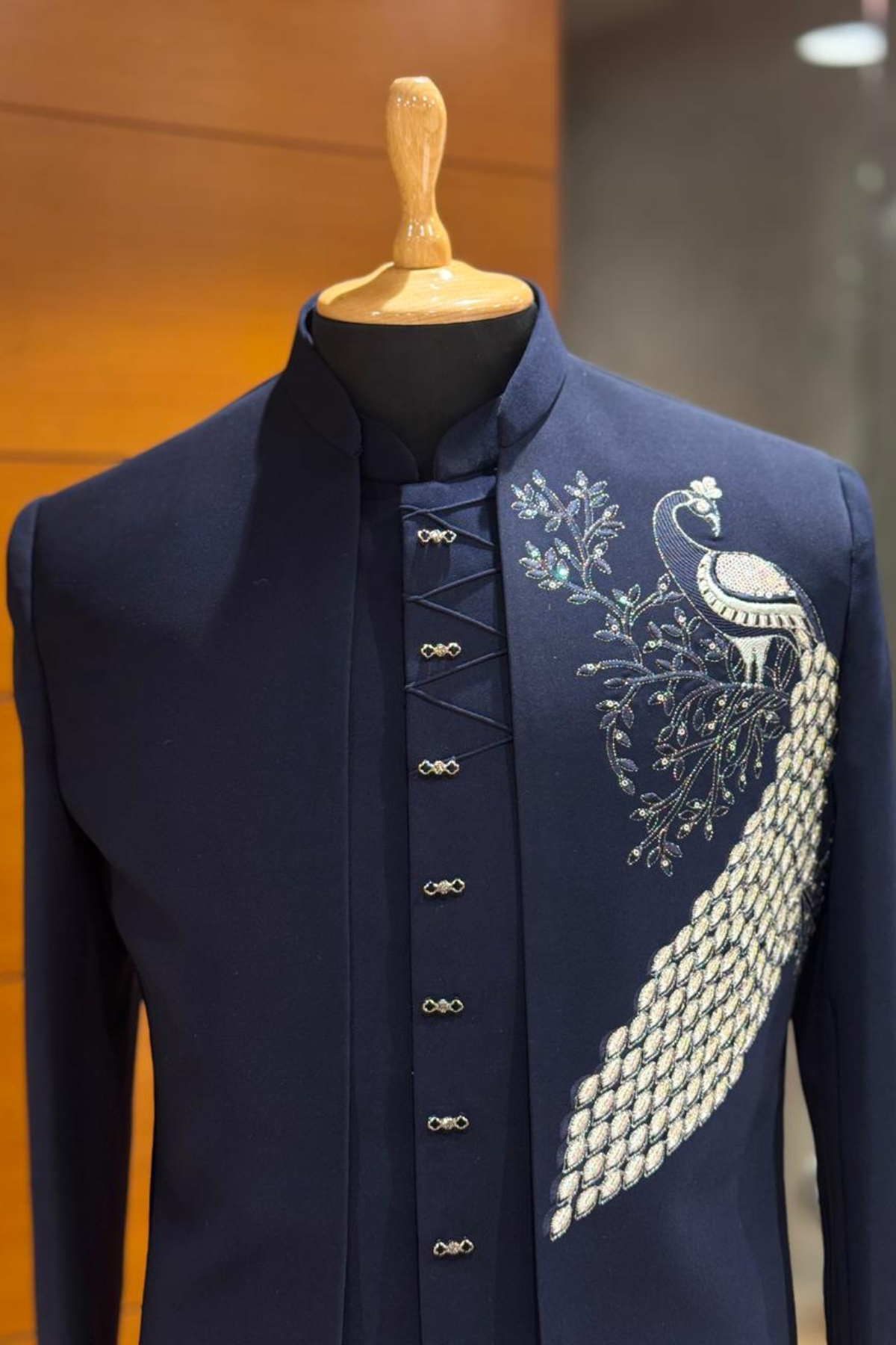 Classic Midnight Blue Jodhpuri Suit, crafted in a rich and striking blue shade that radiates sophistication. Made from smooth, premium non-textured suiting fabric, this Jodhpuri offers a clean, sharp, and regal silhouette. The classic bandhgala collar, refined buttons, and impeccable tailoring create a perfect blend of royal tradition and modern elegance—ideal for men who want to stand out effortlessly at grand occasions.
