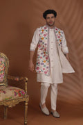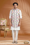 This White Kurta Pajama Set paired with a vibrant floral embroidered coti jacket is the perfect outfit for festive celebrations. The pure white kurta pajama gives a clean and classy foundation, while the multicolor floral jacket adds a joyful, celebratory vibe. Crafted in premium fabric with detailed embroidery, this set is ideal for weddings, sangeet nights, mehendi functions, or any festive gathering where you want to look refined yet colorful.